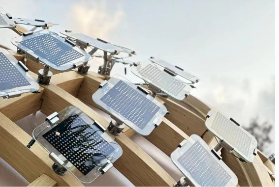 椰林聚落驿站造型源于海南斗笠,布局参考传统古村落。驿站应用高性能、环保的竹木等自然材料作为骨架,顶部覆盖1518块光伏板,收集转化太阳能供给园林照明,降低使用能耗与建筑碳排放。