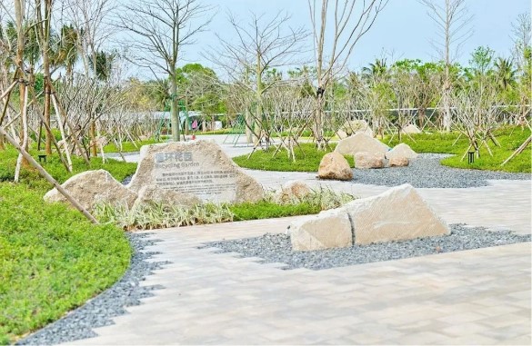 建设中优先使用乡土及再生材料。回收废弃混凝土、废旧木桩/屑、本地石块、建筑渣土等废弃材料,用于地面铺装、景观小品、石笼座椅、地形塑造。建设雨水花园,布设太阳能庭院灯,设置低碳科普标识,倡导低碳生活。