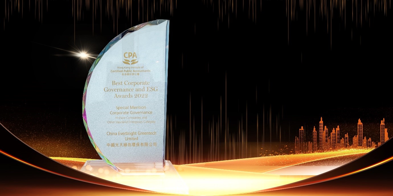 2022年12月15日,香港-中国光大绿色环保有限公司(「光大绿色环保」或「公司」)(股份编号:1257.HK)于香港会计师公会举办的「2022最佳企业管治及ESG大奖」评选中,摘得H股公司与其他中国内地企业组别「企业管治奖」评判嘉许,彰显公司在企业管治方面的卓越表现,这也是公司自2018及2021年在该奖项的评选中取得非恒指成份股(小市值)组别「ESG奖」以来,再次获得该大会的嘉许。
