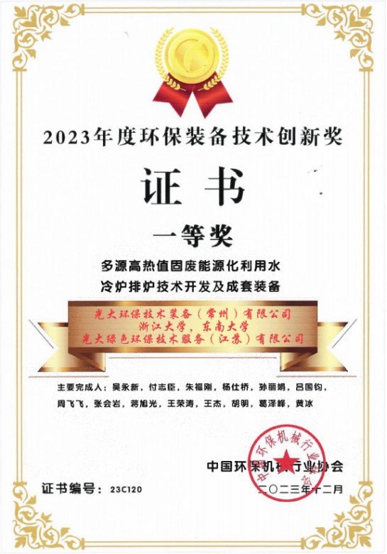 光大技術裝備的水冷爐排技術榮獲中國環保機械行業協會2023年度環保裝備技術創新獎一等獎,這是繼該裝備獲評江蘇省工業和信息化廳“2023年江蘇省首台(套)重大裝備”、江蘇省能源研究會“2023年度科學技術進步獎特等獎”後獲得的又一項榮譽。