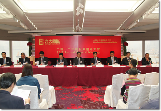 中国光大国际有限公司(“本公司”)于二零一二年四月十八日假座香港湾仔万丽海景酒店八楼美景阁举行了股东周年大会(“股东会”)。出席股东会之执行董事包括主席唐双宁先生、副主席臧秋涛先生、行政总裁陈小平先生、总经理王天义先生、财务总监黄锦骢先生,以及副总经理蔡曙光先生;非执行董事范仁鹤先生;独立非执行董事马绍援先生,以及核数师毕马威会计师事务所代表李家能先生。