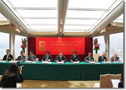 中国光大国际有限公司(“本公司”)于二零一零年五月十二日假座香港湾仔万丽海景酒店八楼美景阁举行了股东周年大会(“股东会”)。 出席股东会之执行董事包括主席唐双宁先生、行政总裁陈小平先生、总经理王天义先生、财务总监黄锦骢先生;非执行董事范仁鹤先生;独立非执行董事锺逸杰爵士、李国星先生和马绍援先生,以及核数师毕马威会计师事务所代表李家能先生。
