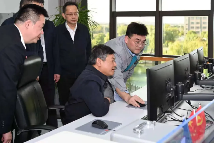 在海盐项目现场,黄润秋一行先后参观了实景沙盘、中央控制室、餐厨厨余垃圾处理车间参观廊道,听取项目负责人对项目规划、工程建设、生产运营管理、烟气工艺与排放指标控制等情况的介绍。