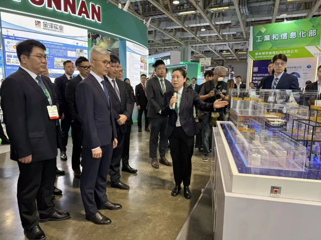 展览首日,澳门特别行政区经济财政司司长戴建业莅临光大环境展台,重点听取了“飞灰资源化处置成套装备技术工艺”介绍,深入了解公司深耕环保产业、以技术创新赋能美丽中国建设的成果举措。国家工信部节能司司长王鹏详细询问“废旧动力电池回收技术产业化”落地情况,关切光大环境申创国家制造业创新中心工作进展,高度肯定公司在技术研发、成果转化及创新平台建设方面的成绩。